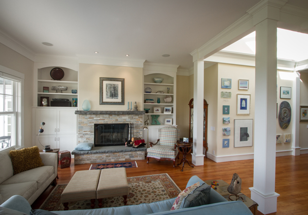 This southern style house includes a large wrap around covered porch overlooking ocean views and coastal landscaping. A 21-foot central glass atrium roof enhances day lighting releasing light into adjacent living spaces. The unique feeling of every room is achieved by varying the vaulted ceiling design with custom trim details and custom paint colors.